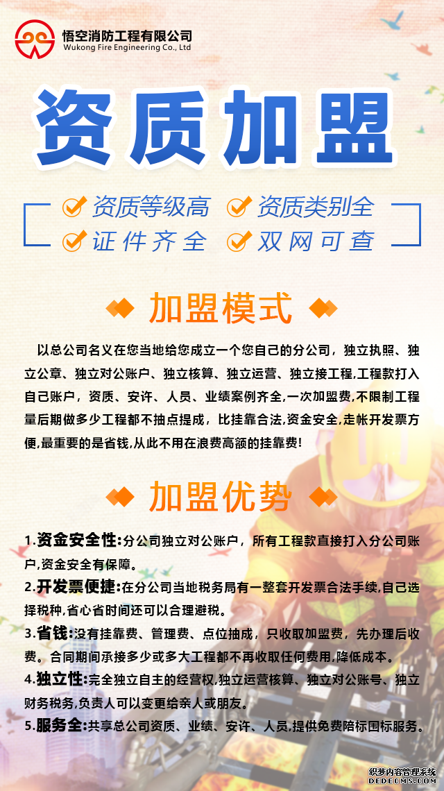 加盟消防一级资质的优势显而易见。首先,加盟企业无需自行办理资质,避免了繁琐的审批流程和高昂的资金成本。其次,分公司在获得资质授权后,可独立开展业务,无需受制于总公司,保持较高的经营自主性。此外,总公司通常会提供技术支持、项目推荐等服务,帮助加盟企业更好地开展业务。